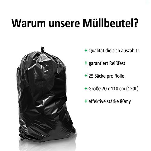 Adatto e adatto: il sacco della spazzatura può essere facilmente agganciato al supporto e al supporto per sacco della spazzatura. Ci sono 25 sacchi sul rotolo. Grazie alla sua elevata stabilità, gode anche di un'eccellente reputazione in cantiere