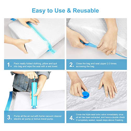【BUONA ERMETICITÀ】Sottovuoto sacchetti ha una sacca con cerniera a tenuta stagna a doppia chiusura e valvola turbo tripla sigillatura per far uscire l'aria in modo efficace e niente torna, perfetta per la conservazione a lungo termine. È possibile utilizzare la pompa elettrica, aspirapolvere o la pompa manuale per inalare. Sacchetti sottovuoto da viaggio manterranno i vostri oggetti puliti,e protetti.