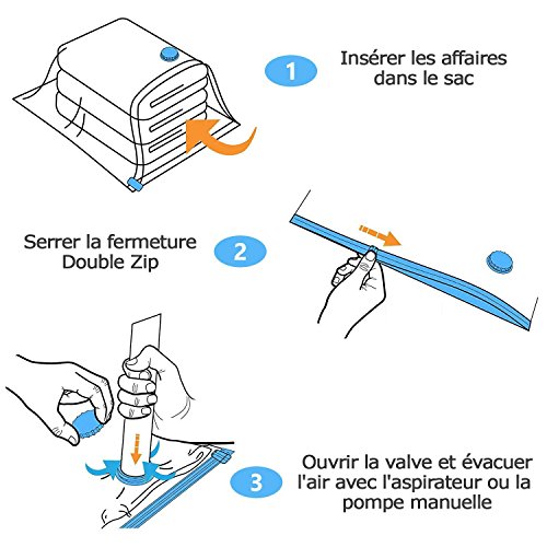 Design ergonomico foglio veloce - la doppia cerniera facilita la chiusura del sacchetto di un gesto "LAMPO, questo che garantisce una buona conservazione impedendo l' intrusione di aria. Provvista di valvola di ritegno, la valvola di estrazione consente di evacuare l' aria istantaneamente con l' aspirapolvere. In caso di viaggio/viaggio: una pompa manuale è inclusa (si avvita persino la valvola, questo che rilascia una mano).