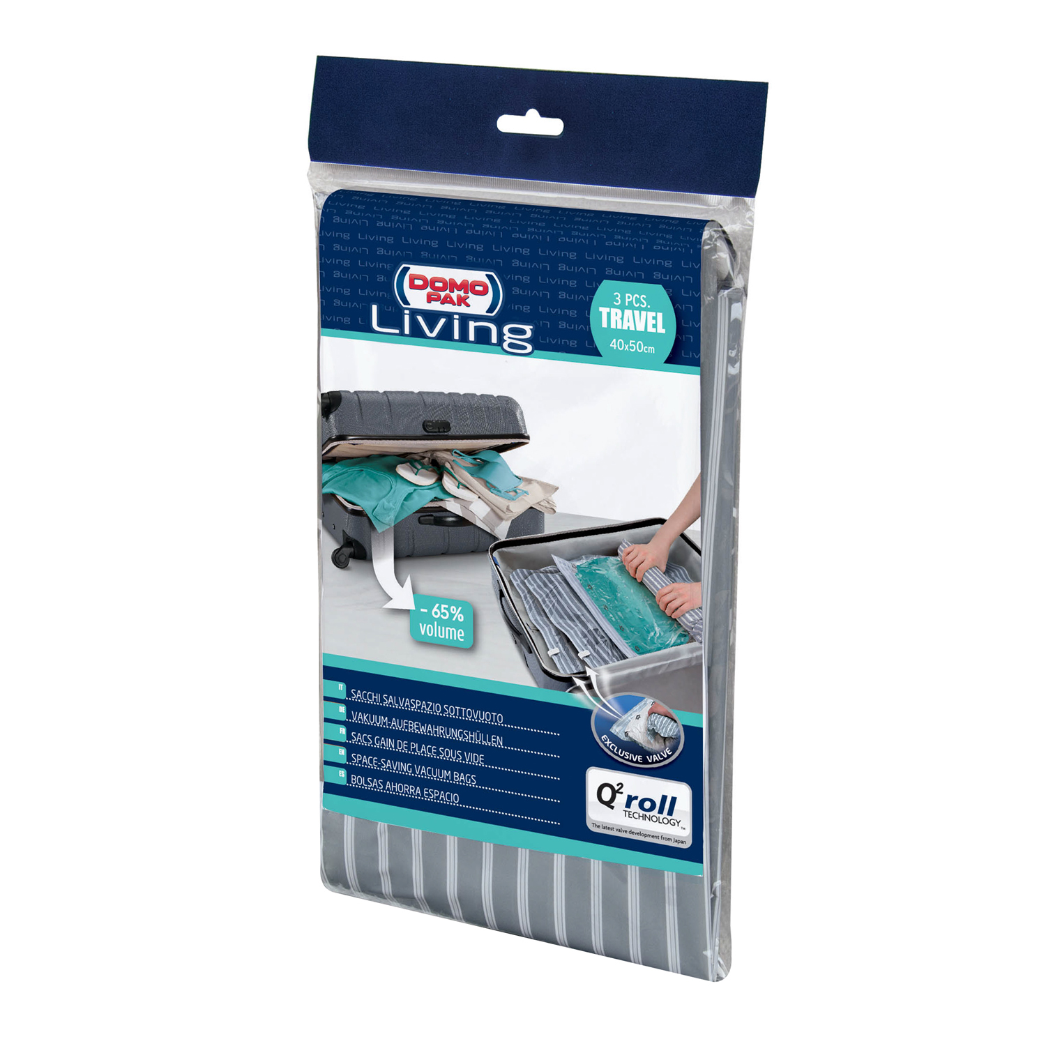 Questo set di Domopak Living include 3 sacchetti salvaspazio sottovuoto che ti permettono di riporre ordinatamente biancheria e vestiti occupano fino al 65% di spazio in meno in valigia o negli armadi. Dimensioni: 50x40cm.