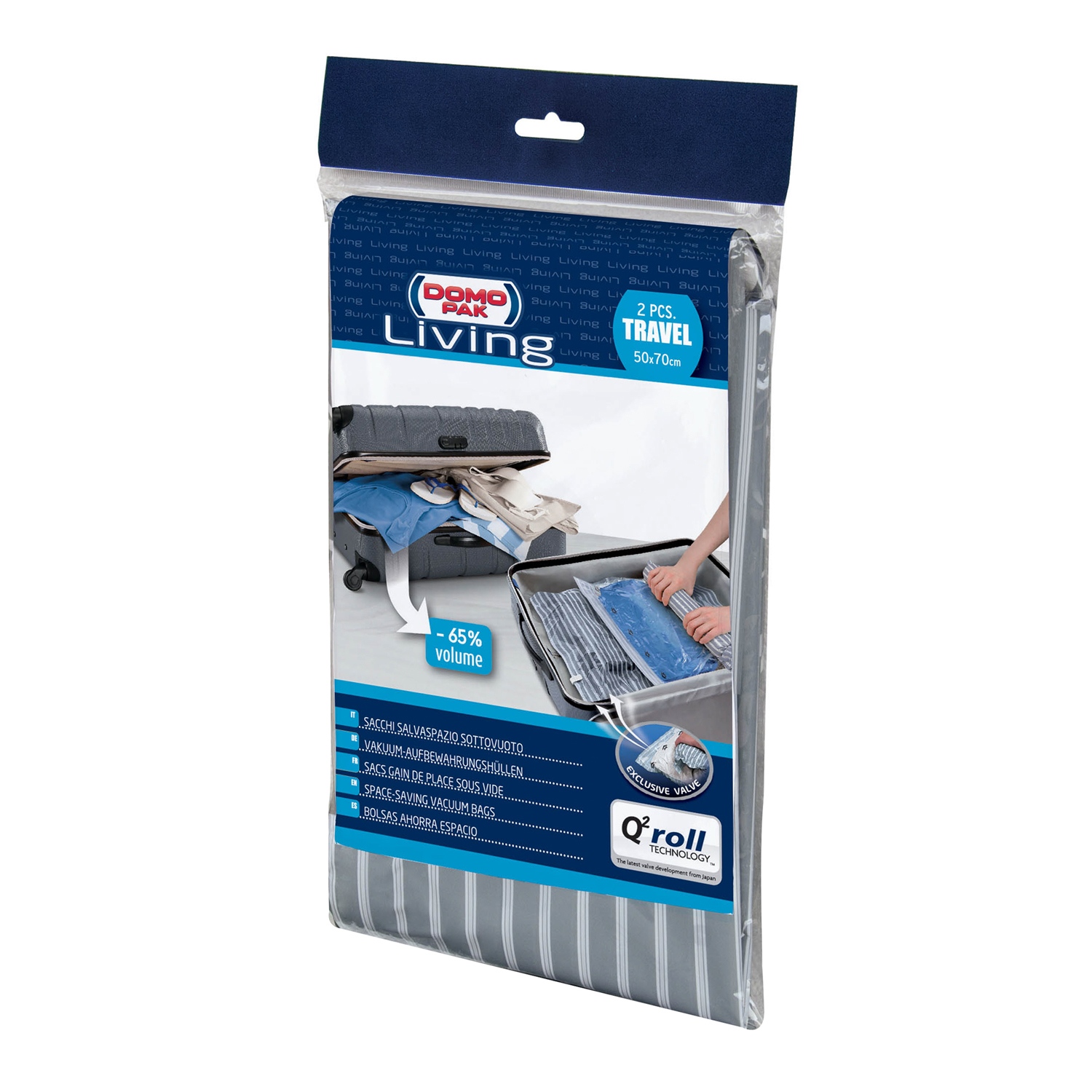 Questo set di Domopak Living include 2 sacchetti salvaspazio sottovuoto che ti permettono di riporre ordinatamente biancheria e vestiti occupano fino al 65% di spazio in meno in valigia o negli armadi. Dimensioni: 50x70cm.