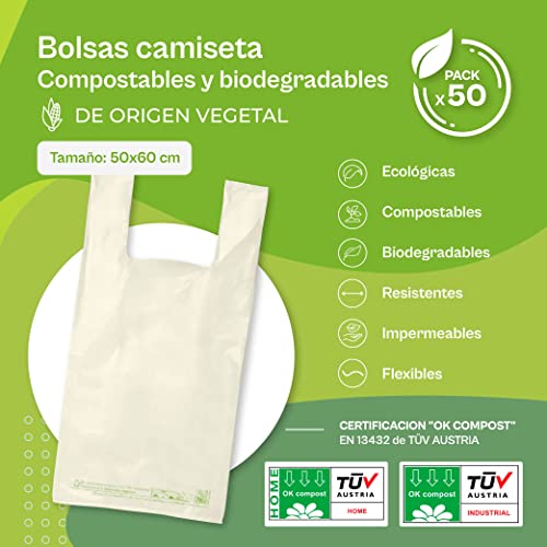 ♻✅ SACCHETTI CON MANICO PER COMODITÁ: Confezione da 50 sacchetti ecologici per tutti i tipi di imballaggio alimentare. Le nostre borse sono biodegradabili, il che significa che sono in grado di disintegrarsi e decomporsi naturalmente per l'azione di agenti biologici come microrganismi, funghi, batteri o alghe, insieme ad altre condizioni ambientali che si verificano in natura, come la presenza di sole o acqua.