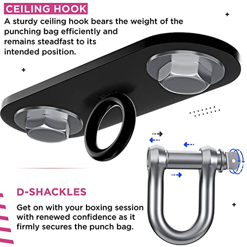 IN ATTESA DEL BREVETTO ANELLO X con 4 robusti anelli a D sopporta circa 5 piedi di sacco da boxe pre-riempito, circa 20 - 22 KG / (44 - 48 lb) (capacità massima di riempimento 50 - 60 KG / (110 - 132 lb)) e 18 - 20 KG / (39 - 44 lb) pre-riempito in 4 piedi (capacità massima di riempimento 40-50 KG / (88 - 110 lb)).