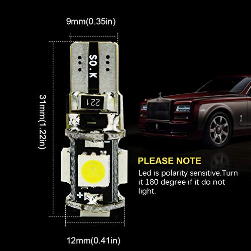 ☛【Illuminazione 360 gradi】- W5W LED Ogni lampadina ha 5 5050 SMD su di esso, 6000K luce allo xeno bianca, angolo di illuminazione a 360 gradi, nessun punto cieco. In aggiunta ha una maggiore luminosità, una maggiore durata e un maggiore risparmio energetico.