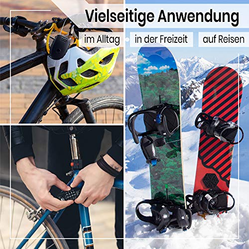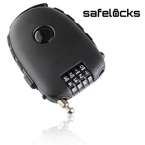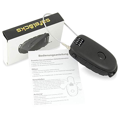 Safelocks, serratura a cavo, modello Premium, chiusura a combinazione con cavo e codice a 4 cifre, ideale uso con bicicletta, sci, snowboard, passeggino, per quando si è viaggio, valigia e bagagli. Cavo con una lunghezza di 90 cm, arrotolabile, Nero