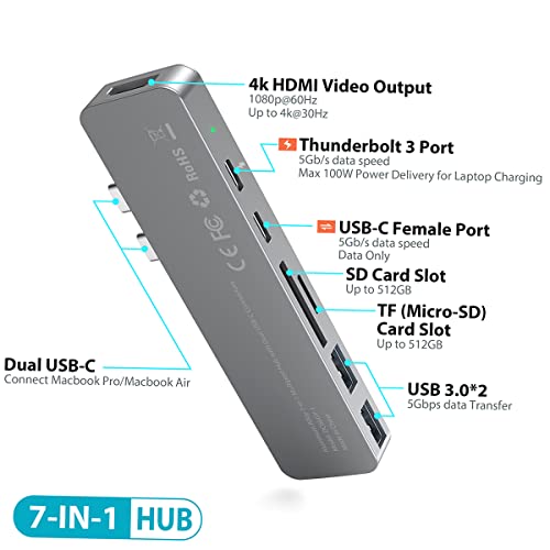 Safysoo USB-C Hub Adapter 7-in-1 Multiport Hub with 4K HDMI Video Output, Thunderbolt 3 100W PD Port, 2* USB 3.0 Porte, SD/TF Card Slot, USB-C Port Compatible with MacBook Air/Pro