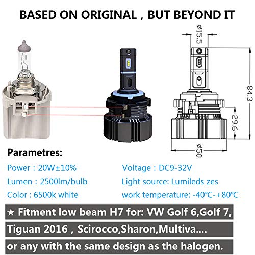 ★ 20w, 2500lm, 6000k bianco ogni lampadina H7, chip zes, migliore dei chip csp e 300% più luminoso delle lampadine alogene.