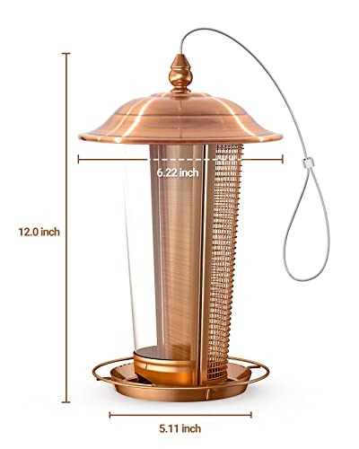 【FACILE DA APPENDERE E NUTRIRE】Ha un facile coperchio twist-off, basta svitare la parte superiore, rimuovere il coperchio e versare il mangime nella gabbia. Gli anelli di sospensione da 25 cm lo rendono facile da posizionare su un ramo o su un albero di alimentazione. C'è un trespolo su ogni lato per un facile accesso. Viene fornito con un coperchio twist-lock e fori di drenaggio per mantenere il coperchio ben chiuso e i semi freschi e asciutti.