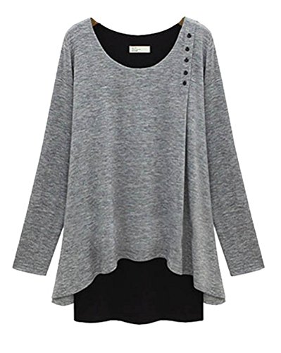 SaiDeng Donna Girocollo Sciolto Camicia Manica Lunga Falso Due Pezzi Camicetta Pullover Grigio 4XL