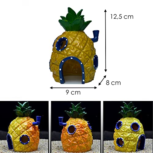 Dimensioni: casetta di ananas 9 x 8 x 12,5 cm, casa a isola Thadäus 8,5 x 8,5 x 14,5 cm e Krusty Krab 9,5 x 6 x 8,5 cm, adatta per acquari medi e grandi.