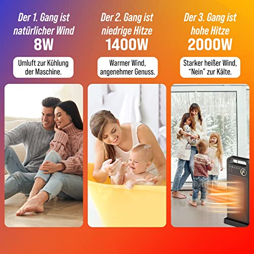 Riscaldamento 3s: il termoventilatore ceramico PTC di alta qualità può riscaldarsi rapidamente in 3 secondi, e la funzione di riscaldamento a temperatura costante del riscaldatore elettrico da 2000w vi fornirà una temperatura confortevole e uniforme con alta efficienza e risparmio energetico