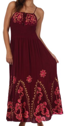 Il design unico presenta ricchi colori solidi, ampia vita impero con smock, delicata stampa batik ricamata che accentua una gonna a cerchio pieno.