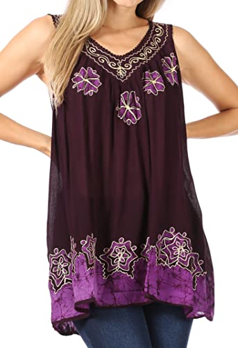 Sakkas 097 Camicetta Senza Maniche con Scollo a V Ricamata in Batik - Melanzana/Taglia Unica
