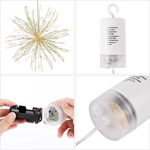 Plug and Play: la scatola della batteria viene fornita con il pacchetto (le batterie non sono incluse), devi solo inserire 4 batterie AA, quindi puoi appenderlo e scegliere la modalità che ti piace. Il fuoco d'artificio si accenderà con un colore bianco caldo.