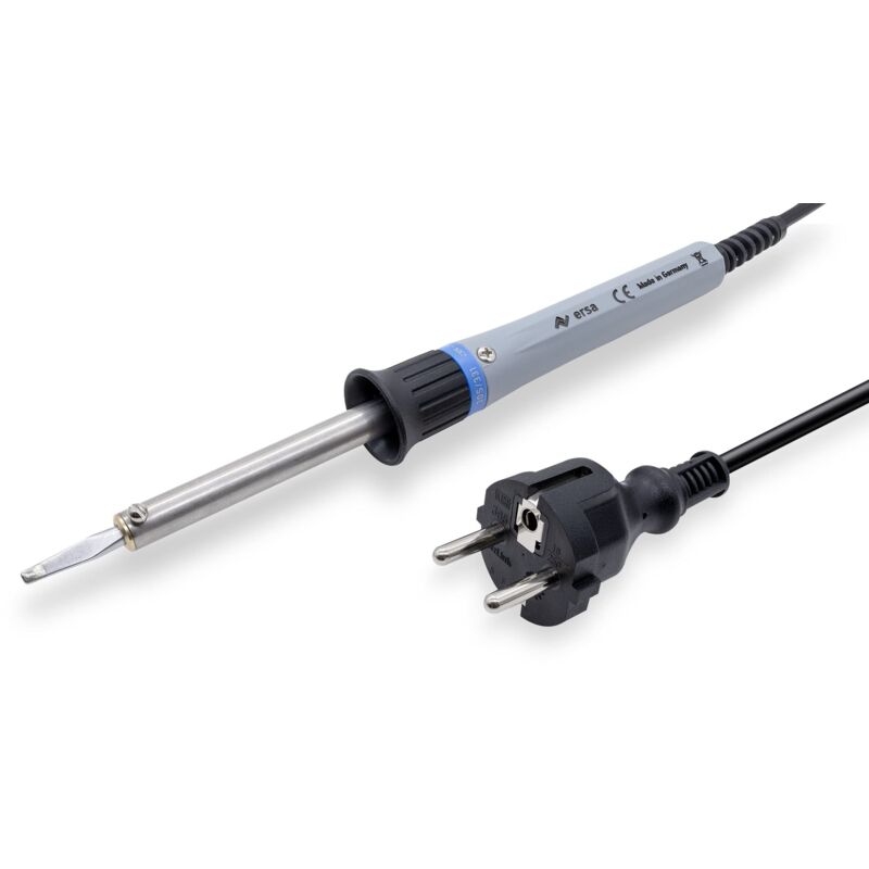 Dettagli tecnici Peso 80 g Potenza (max.) 30 W Temperatura (max.) +380 °C Tensione di funzionamento 230 V Tipo prodotto Saldatore Peso:. 80 g (senza linea di alimentazione) Saldatore fine ERSA 30 S Il saldatore universale ERSA 30 S, collaudato in milioni di pezzi, è noto in tutto il mondo per la sua robustezza e durata. È utilizzabile in modo versatile per lavori di saldatura nei settori dell'artigianato, dell'assistenza e dell'hobby. La fornitura comprende un pratico e leggero Punti di forza e dettagli Il saldatore a mano da 30 W di successo Incluso nella consegna Disco di applicazione in gomma Punta di saldatura a scalpello 032 AD ERSADUR. Requisiti di sistema null