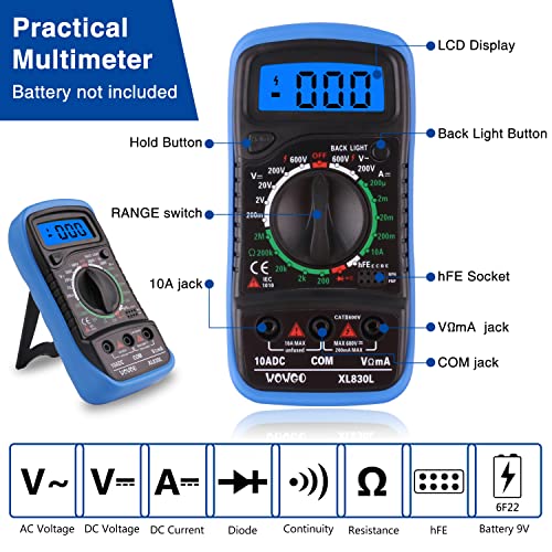 【Multimetro Digitale Multifunzione】 Pratico per misurare la tensione CC&CA, la corrente CC e CA, la resistenza, i diodi, i transistor hFE, test di continuità;