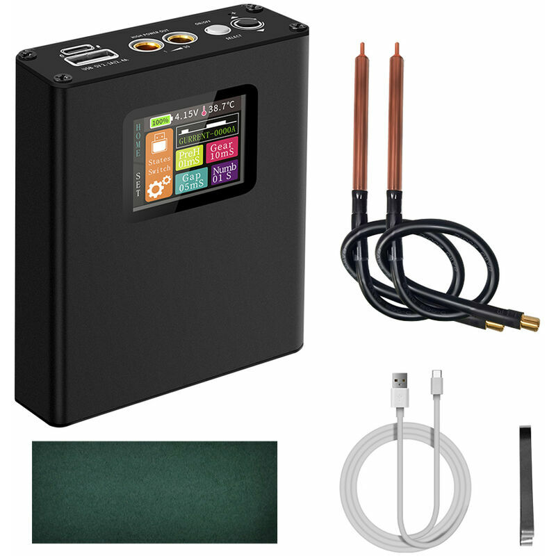 Questa saldatrice a punti ha un design ad alta potenza con un processo di saldatura più preciso. Dotato di display digitale, è possibile visualizzare chiaramente la corrente di saldatura, il tempo dell'impulso, l'intervallo degli impulsi, il numero di tempi di saldatura a punti continui e altri parametri, è possibile leggerlo a colpo d'occhio. I tre parametri di tempo di riscaldamento, intervallo di impulsi e frequenza degli impulsi possono essere regolati. Puoi regolare la luminosità dello schermo, i tempi di spegnimento automatico e altre opzioni, incluso l'utilizzo della registrazione per mostrare le ore di fabbrica. Può saldare saldamente lamiere di acciaio nichelato da 0,25 mm e lamiere di nichel puro da 0,15 mm dopo una carica completa. La batteria può essere mantenuta a una tensione di standby per lungo tempo senza essere utilizzata. Caratteristiche: Principio di funzionamento: controlla le due batterie al litio ad alta velocità tramite un programma nel microcontrollore