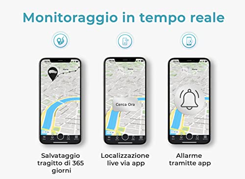 LOCALIZZAZIONE ONLINE - I vantaggi del nostro rilevatore GPS includono la localizzazione accurata in tempo reale in tutto il mondo e 365 giorni di memoria. Tutti gli allarmi possono essere impostati facilmente tramite l'app gratuita. Piani disponibili: 4,17€ al mese (99,99€ pagamento unico ogni 2 anni), 4,99€ al mese (59,88€ pagamento unico all'anno), o 6,99€ al mese (6,99€ pagamento mensile)
