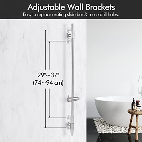 Installazione Flessibile: la asta doccia è dotata di due staffe regolabili, che consentono un facile allineamento con i fori esistenti o può essere fissata alla linea di fuga senza danneggiare le piastrelle. La distanza regolabile tra le due staffe è compresa tra 740 mm e 940 mm.