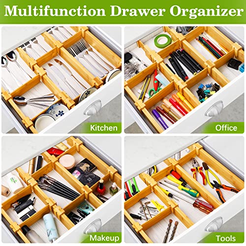 Facile da installare: Ogni organizzatore di cassetti ha una piccola vite su un'estremità che aiuta a fissare la lunghezza scelta dei divisori lunghi, si posiziona il divisore dove si vuole, lasciare che la molla si estenda per tenere. Spostando il cursore, spostare liberamente la distanza tra gli inserti. Silicone anti-scivolo tappetino sulle estremità dei divisori cassetto cucina di bambù aiutare a mantenere il cassetto organizzatori evitare di graffiare i cassetti.
