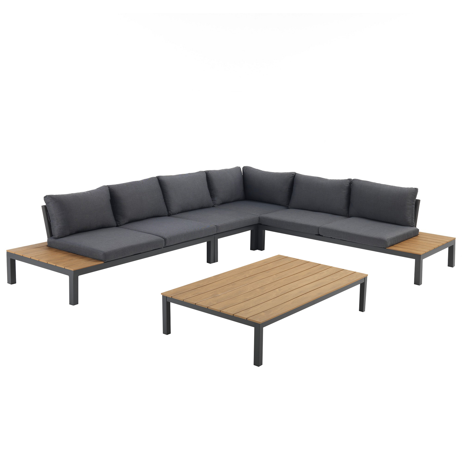 Il salotto Lilja è l'elemento che stavi cercando per completare la decorazione del tuo giardino. È realizzato da OresteLuchetta, brand del gruppo Tomasucci che garantisce qualità ed innovazione. Questo modello trasferisce all'esterno il comfort del tuo salotto, combinando una resistente struttura in alluminio e legno con finitura rovere con i morbidi cuscini rivestiti in poliestere di colore grigio, per una morbidezza ed un comfort extra. Include un 1 bellissimo divano angolare: H.76 x L.315 x P.247 cm, portata massima 200 kg ed un grazioso tavolino da tè: H.80 x L.140 x P.80 cm.