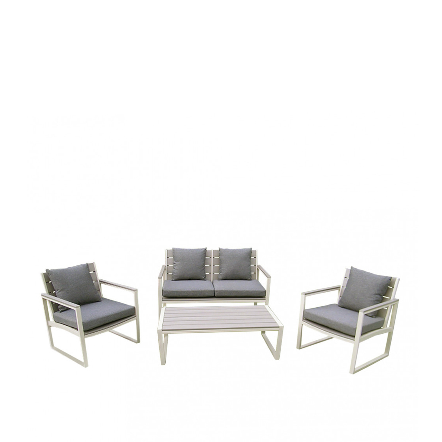 Comodo divano a due posti, due belle poltrone e un delizioso tavolino da tè. Il salotto da esterni Sirio ha un design moderno che per linee e forme riprende lo stile industrial declinandolo in una versione più essenziale ed elegante, perfetta per arredare il giardino o il terrazzo. La struttura delle varie componenti è realizzata in resistente alluminio con elegante finitura semiopaca color tortora. Piano del tavolo, sedute, schienali e braccioli sono invece in polywood. Morbidi cuscini grigi assicurano tutta la comodità che cerchi.