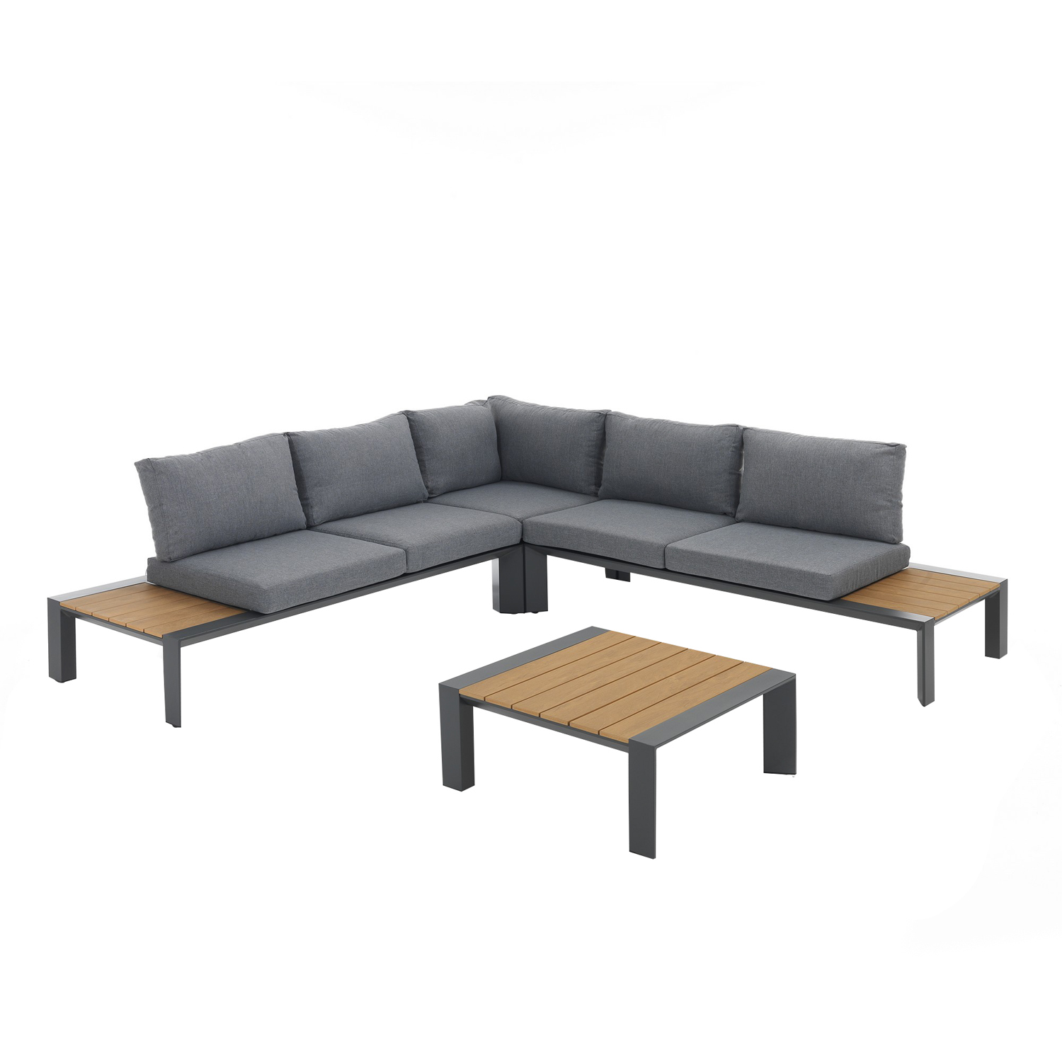 Il salotto Valdis completa la decorazione del tuo giardino con il tocco di stile che cerchi. È realizzato da OresteLuchetta, brand del gruppo Tomasucci che garantisce qualità ed innovazione. Questo modello trasferisce all'esterno il comfort del tuo salotto, combinando una resistente struttura in alluminio e legno con finitura rovere con i morbidi cuscini rivestiti in poliestere di colore grigio, sfoderabili e sofficissimi. Il set include un 1 bellissimo divano angolare: H.80 x L.244 x P.244 cm portata massima 200 kg ed un grazioso tavolino da tè: H.33 x L.74 x P.74 cm.