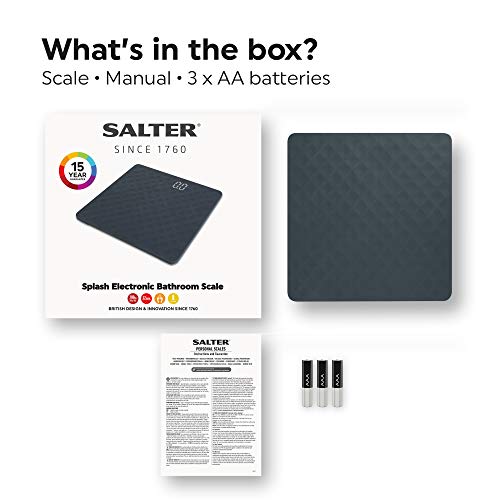 Salter 9218 GY3R Splash - bilancia pesapersone compatta, elettronica da bagno, max 190 Kg, antiscivolo, display LED nascosto, 4 colori disponibili, 15 anni di garanzia, grigio ardesia