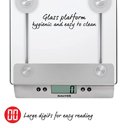 Salter 3003 SSSVDR08 Aquatronic - Bilancia elettronica da cucina, bilancia da cucina digitale di precisione, permette di pesare i liquidi, funzione Aggiungi e pesa, vetro e acciaio inox, 5Kg