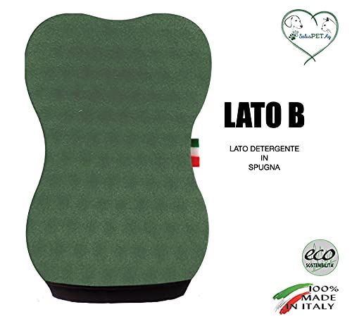 FUNZIONALITA': LATO DETERGENTE (verde) in SPUGNA Dopo aver SPAZZOLATO BENE il PELO, passare il GUANTO bagnato SOLO d'ACQUA su MUSO, CORPO, CODA, ZAMPE e POLPASTRELLI, per RIMUOVERE in modo NATURALE, ogni traccia di sporcizia. A differenza delle normali spugne (da usare con saponi) in questo “brevettato” GUANTO, è presente una SPECIALE fibra (contenente IONI ARGENTO), che permette un'AZIONE DETERGENTE contemporanea a quella C IGIENIZZANTE con il SOLO u