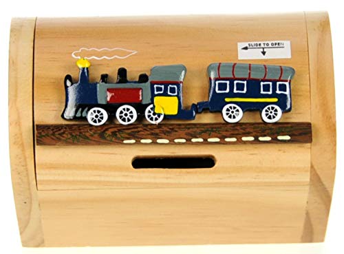 Salvadanaio per bambini con chiusura segreta Regalo di compleanno per ragazzi, ragazze e bambini di tutte le età. Divertente e tradizionale scrigno del tesoro giocattolo (dimensioni 12 x 9 x 7 cm)., Legno, Blue Train