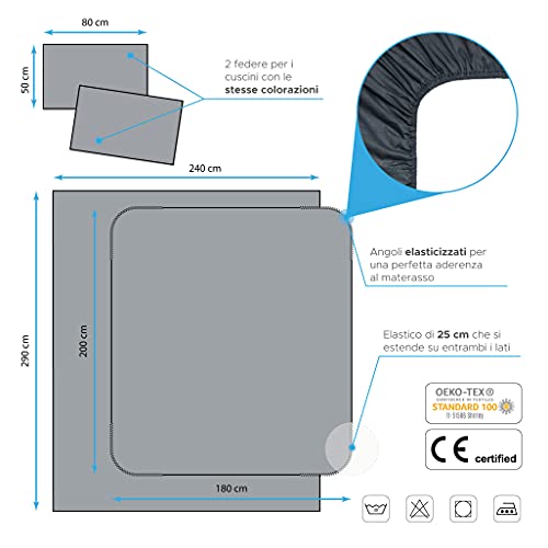 SET COMPLETO OTTIMO PER REGALO NATALIZIO - Include lenzuolo matrimoniale misure 240×290 cm, copri materasso con angoli elasticizzati 180×200 cm, federe 50×80 cm. Realizzato in cotone puro 100% con certificazione Oeko-tex.