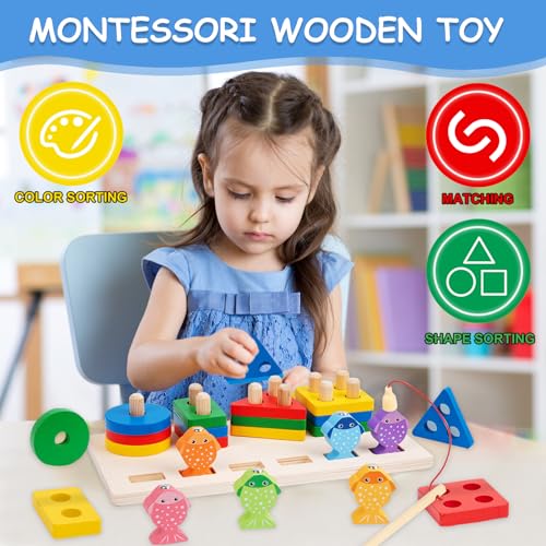 【Giocattolo in legno 2 in 1】 Il nostro giocattolo Montessori è composto da giochi di pesca magnetici e puzzle con blocchi impilabili. Può stimolare l'immaginazione dei bambini e sviluppare capacità motorie, coordinazione occhio-mano, riconoscimento della forma e destrezza.