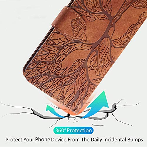 Sammili - Custodia a libro per Samsung Galaxy A21S, motivo albero in rilievo, con chiusura magnetica, con funzione di supporto, scomparti per carte di credito e cinturino da polso (A21s, Marrone)