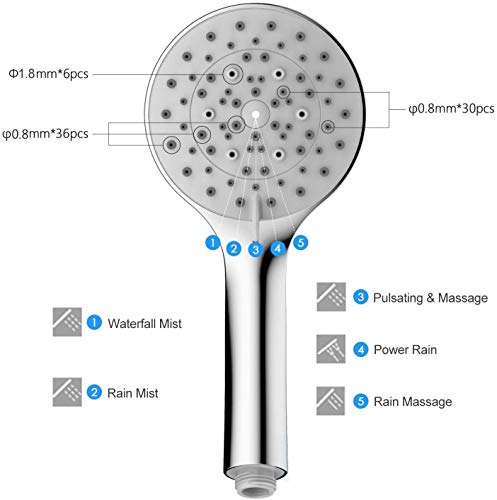 Soffione doccia multifunzione con 5 diverse modalità di spruzzo per scegliere la pioggia potente, la nebbia cascata, pulsante, massaggiante, pulsante e massaggio, offre un'esperienza di bagno ultra confortevole e meravigliosa
