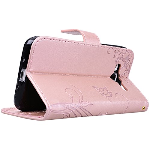 WE LOVE CASE Samsung Galaxy J3 (2016 / 2015) Cover Galaxy J3 J300 J310 Custodia Farfalla Fiore Retro Style per Samsung Galaxy J3 J300 J310 (2016 / 2015) SM-J320F Smartphone Flip PU Leather Design Internamente Silicone TPU Cassa Caso Bumper Protettiva Copertura Anti-Scratch Shockproof Portafoglio Bookstyle con Supporto di Libro Stand / Carte Slot / Chiusura Magnetica + Stylus Pen(Oro Rose)