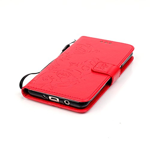 Per Samsung Galaxy J5 2016 Custodia,Funyye Per Samsung J5 (2016 Modello) J510 Pelle Libro Copertura Con Cordino Shell Supporto Stand Porta Carte Portafoglio Flip Wallet Cover Chiusura Magnetica Protezione Caso Elegante Fiori e Farfalle -Rosso