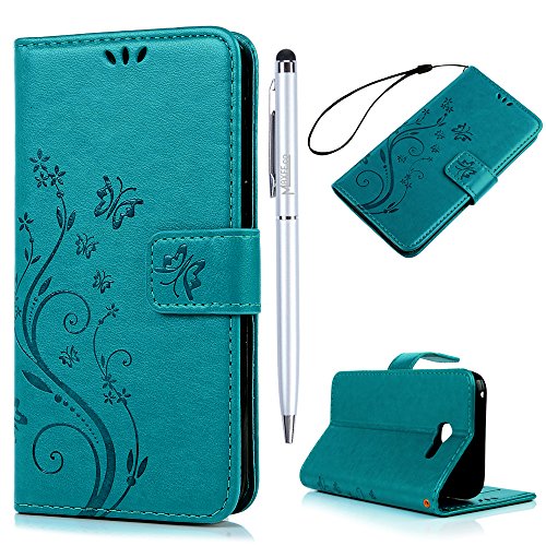 Per Samsung Galaxy A5 2017 custodia in pelle (13,2 cm) Maxfe.Co Premium Butterfly Flying around Flower Vines motivo goffrato PU copertura del telefono con intarsi in silicone e TPU flessibile vassoio magnetico chiusura cinturino da polso resistente antiurto integrato cavalletto per carta fessura tasca Slim notebook Diary Style stabile supporto magnetico Folio Flip bumper Shell custodia per 13,2 cm Samsung Galaxy A5 2017 Release + One personalizzato pennini da Maxfe.Co Blue