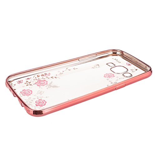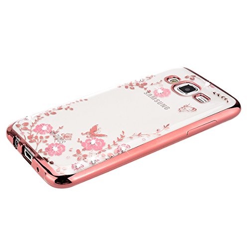 WE LOVE CASE Per Samsung Galaxy J5 (2015) Custodia Secret Garden Silicone TPU Shine Strass Bumper Sottile Gel Cover Trasparente Chiaro Slim Copertura Portafoglio Originale Morbida Shell Protettiva Case + Pellicola Protettiva + Spina Della Polvere + Penna Stilo Oro Rosa Frame Fiori e Farfalla