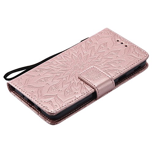 Samsung Galaxy J5 Prime Custodia in Pelle, Cover per Samsung Galaxy On5 2016 [Con protezione in vetro temperato + 1 penna a stilo] NEWSTARS Goffratura Mandala Design - Retro Girasole Fiore - Book Style Internamente Silicone TPU Case Protettiva Folio Flip Custodia Con Cinturino da Polso per Samsung Galaxy J5 Prime / On5 2016 SM-G570. KT- Mandala Rose Gold