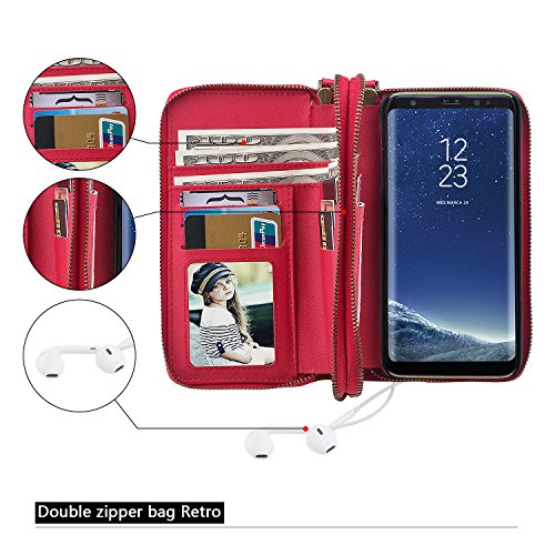Samsung Galaxy S8 separabili rimovibile in caso di lusso di Fqiao PU cavalletto Protable Protector con 2 grandi zip portaoggetti e un sacco di carte, pellicola protettiva Defender antiurto protezione completa con contanti slots, Frams per Samsung Galaxy S8 2017 Release rosso red