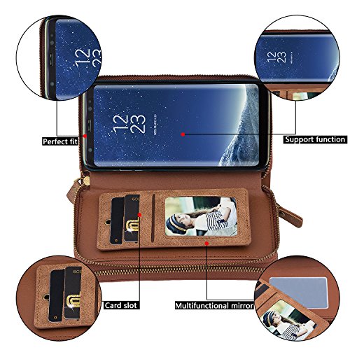 Samsung Galaxy S8 separabili rimovibile in caso di lusso di Fqiao PU cavalletto Protable Protector con 2 grandi zip portaoggetti e un sacco di carte, pellicola protettiva Defender antiurto protezione completa con contanti slots, Frams per Samsung Galaxy S8 2017 Release marrone brown
