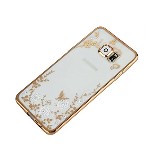 Per Samsung Galaxy S6 Edge Trasparent Fiori Custodia in TPU Silicone,Per Samsung Galaxy S6 Edge chiaro caso di strass tpu copertina morbida con bling glitter design,Herzzer elegante di lusso (Oro) Galvanotecnica placcatura pagina del respingente [Fiore Bianca Modello] Gel di cristallo morbido silicone flessibile Shell Custodia protettiva copertura della pelle Per Samsung Galaxy S6 Edge + 1 x Bianca telefono cellulare Cavalletto + 1 x Pennino Argento