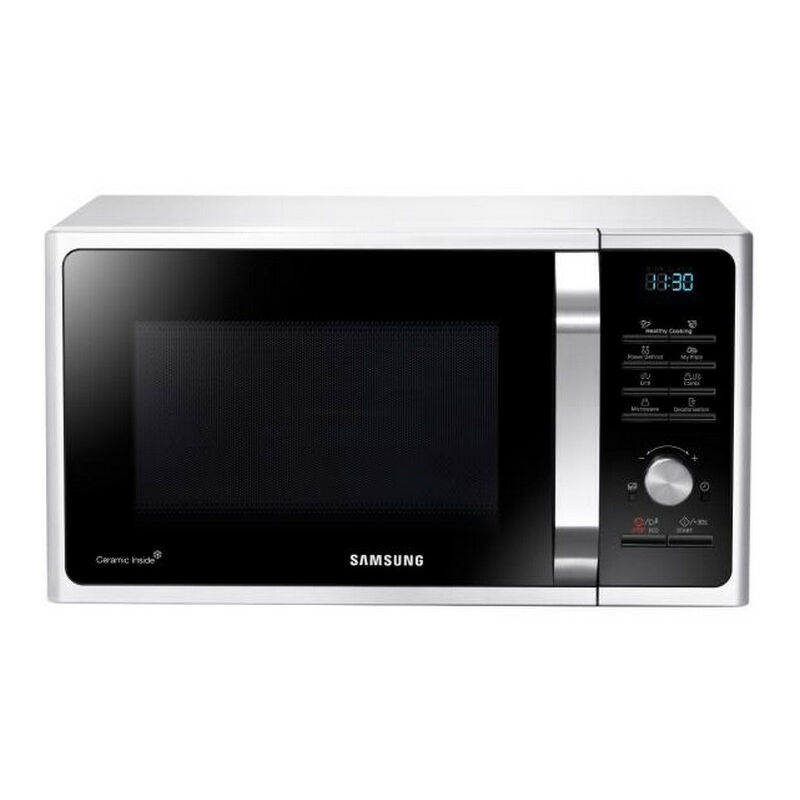 Microonde grill Samsung MG28F303TAW con 6 livelli di potenza e comandi elettronici con led blu. Tipo di prodotto: microonde. Capacità: 28 litri. Potenza microonde: 900 Watt. Livelli di potenza: 6. Potenza grill: 1500 Watt. Piatto girevole Ø: 31,8 cm. Cavità: smalto ceramico. Programmazione: elettronica. Piatto croccante: n. Funzione vapore: no. Accessorio vapore: n. Il prodotto +: vassoio sganciabile. Livelli di potenza: 6. 20 menu salutari e 4 sbrinamento automatico Power Defrost. Funzioni di dessert e deodorizzazione. Modalità ecologica. Promemoria acustico di fine cottura. Timer 99 min. Orologio 12/24 ore. Piatto girevole Ø 31,8 cm disinseribile. Cavità in ceramica smaltata. Manico in argento. Finitura bianca. Colori: bianco. Dimensioni cavità (LxAxP): 35,7 x 25,5 x 35,7 cm. Dimensioni (LxAxP): 51,7 x 29,7 x 44,4 cm. Peso netto: 16 Kg.