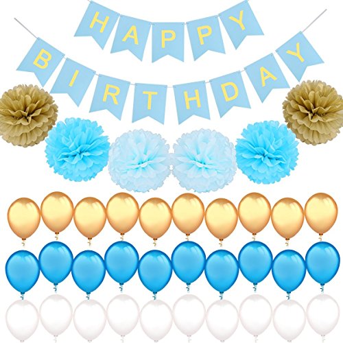 Questo set di decorazioni per compleanno include: 30 x 12 palloncini in lattice (10 x blu + 10 x bianco + 10 x oro);
