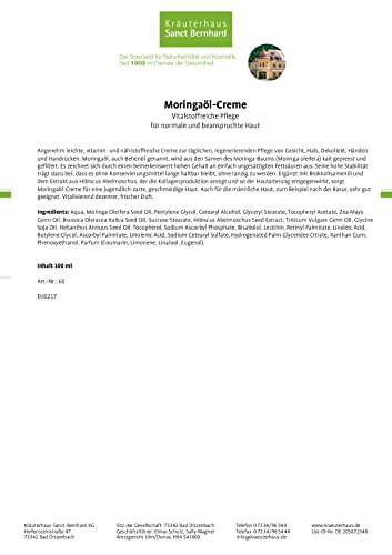 Sanct Bernhard, crema all'olio di moringa, 100 ml, cura ricca di elementi vitali, per pelli normali e sollecitate (etichetta in lingua italiana non garantita)
