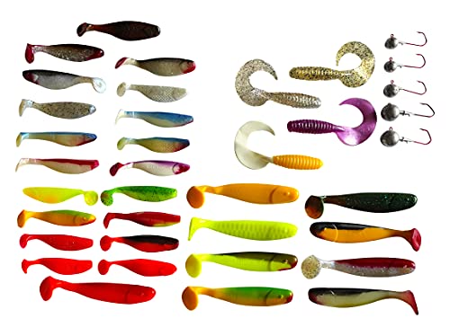 9 esche in gomma da 16 cm + 4 twister in gomma da 13 cm + 19 pesci in gomma da 11 cm