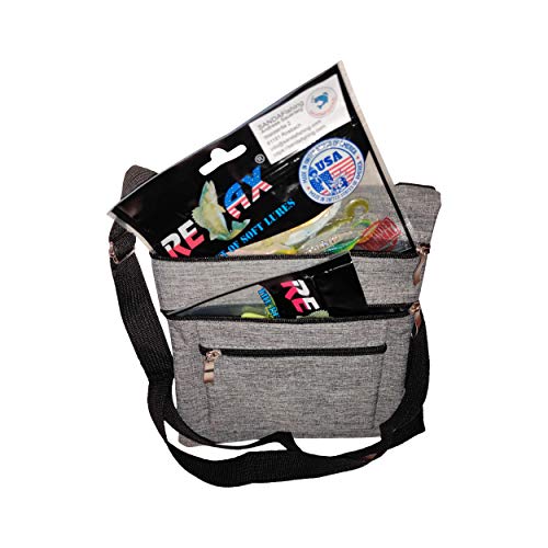 24 esche in gomma Relax per la pesca di pesce persico, trota e luccioperca. La borsa da pesca grigia misura 20 cm di larghezza e 25 cm di altezza e sostituisce lo zaino da pesca. Piccola borsa ideale per la pesca.