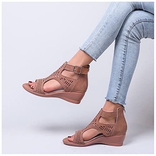 Sandali da Donna Aperti Davanti Chiusi Dietro, Sandali con Plateau Donna con Supporto Ad Arco, Traspiranti Scarpe da Spiaggia, Sandali Aperti Donna in Pelle con Zeppa(Size:40EU,Color:Marrone)