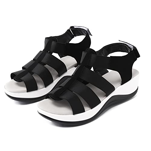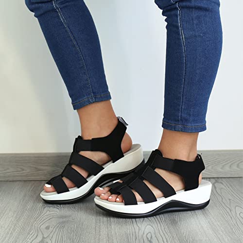 Sandali da donna estivi traspiranti in tessuto elasticizzato con zeppa e zeppa, Nero, 38 EU